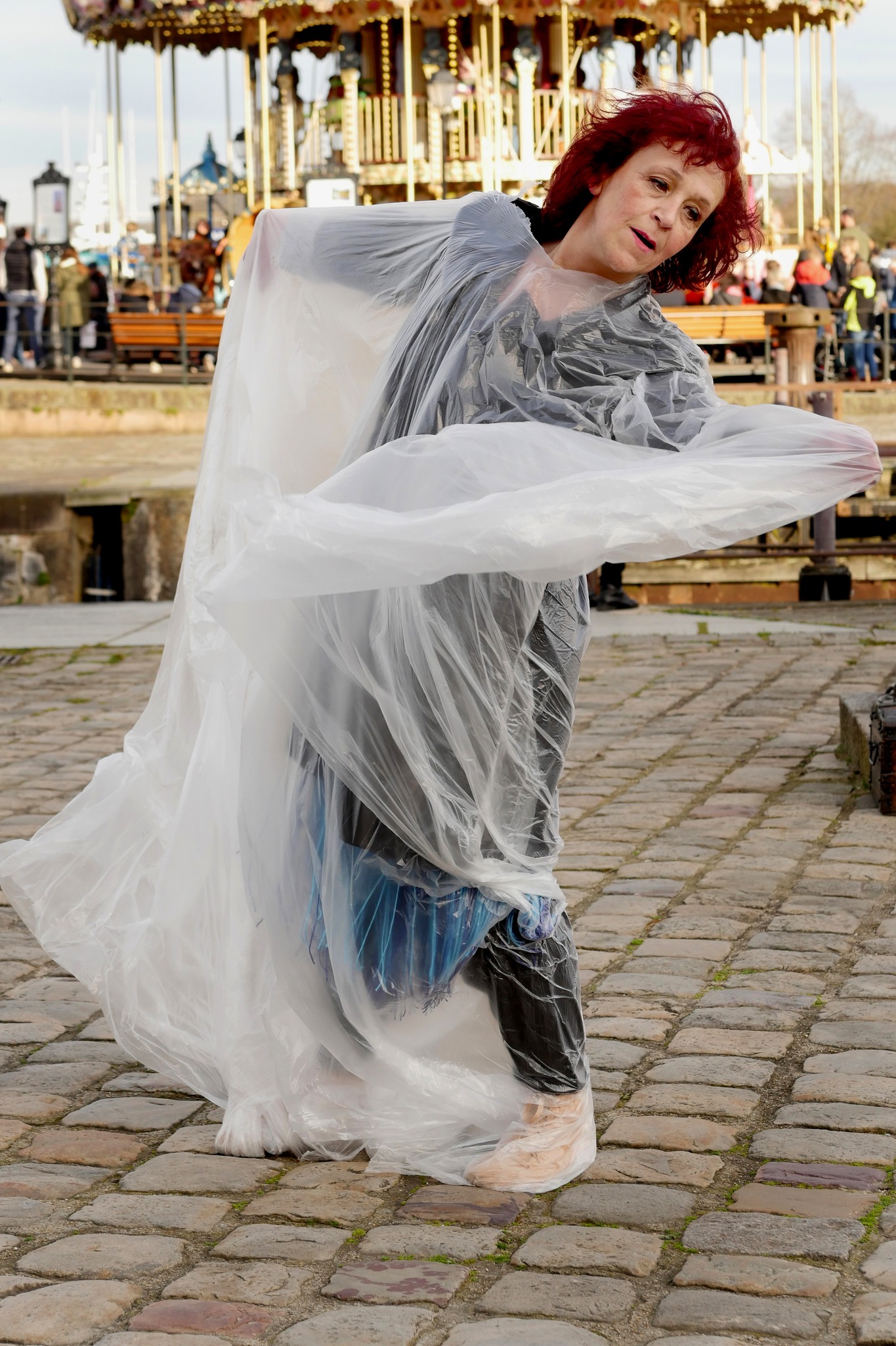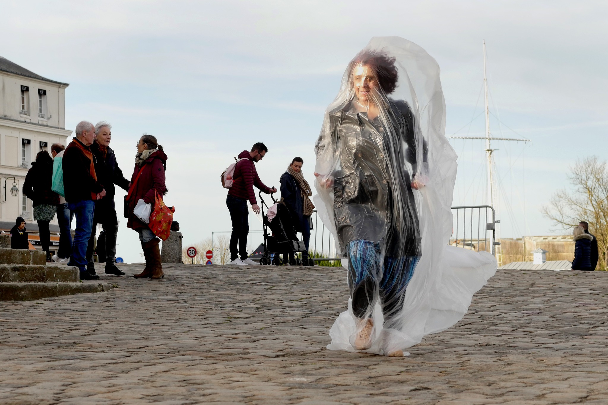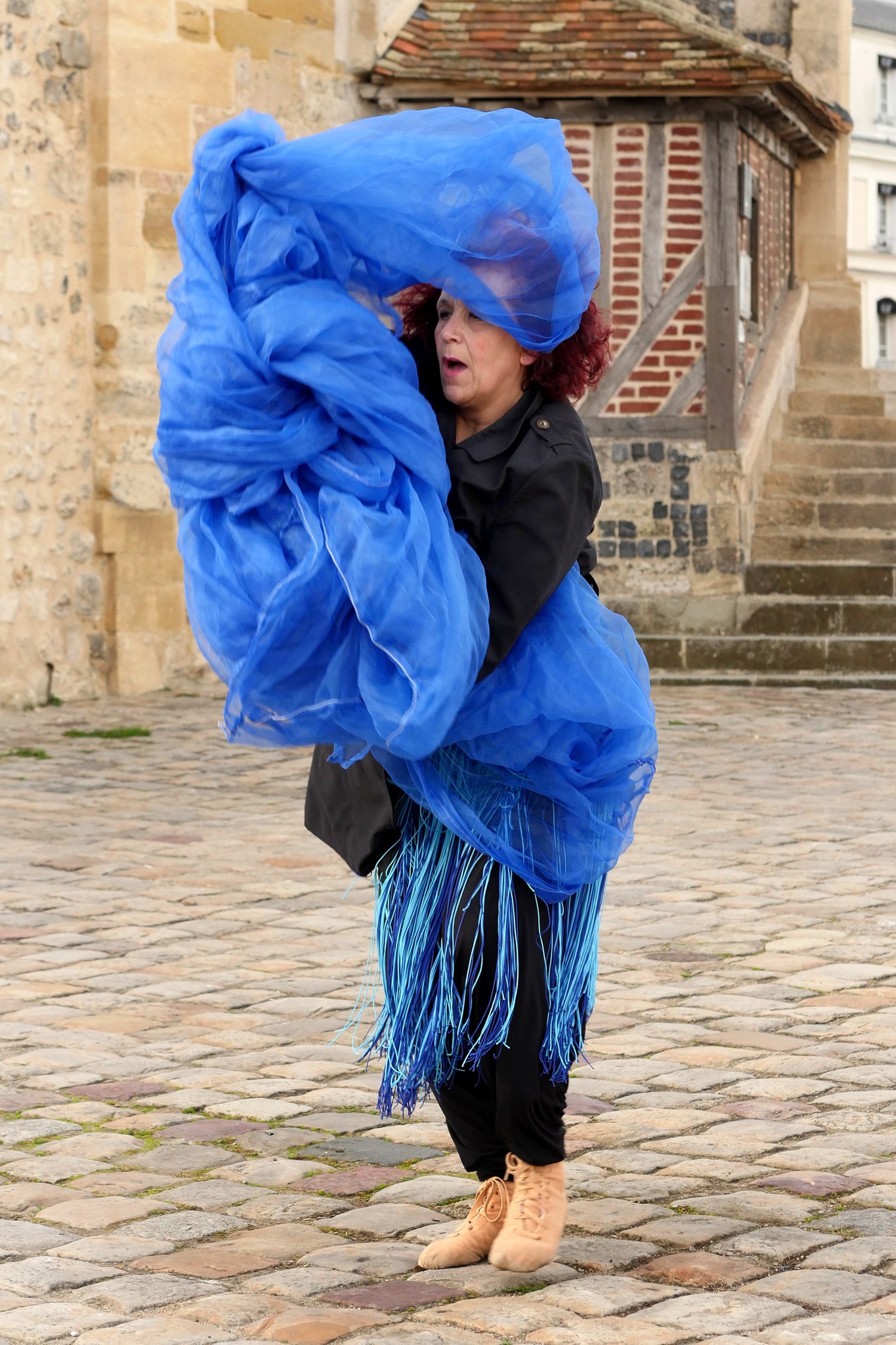 Mars 2024, le port de Honfleur, au bord de l’eau, la danseuse évolue dans un tissu bleu fluide, et chemin faisant, l’eau se fait solide, se fait légère.