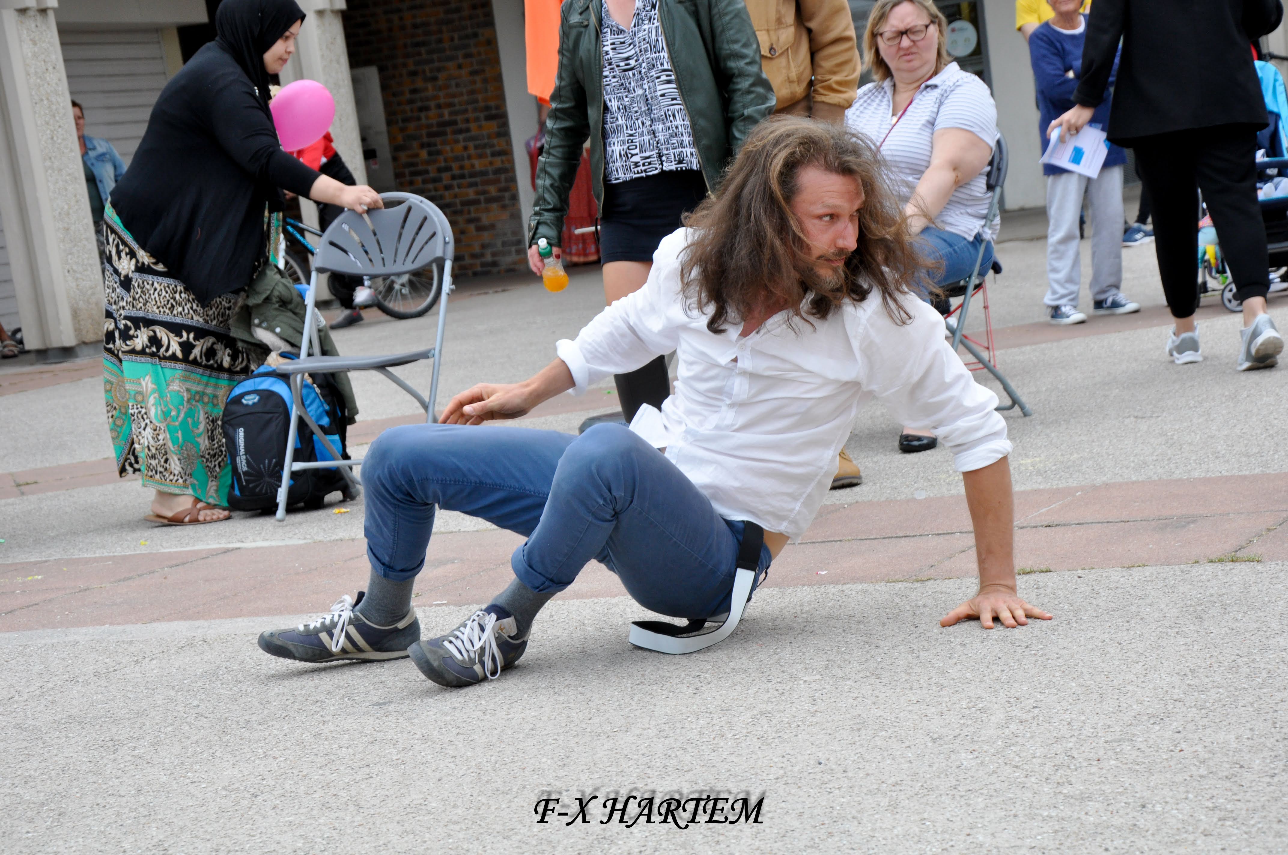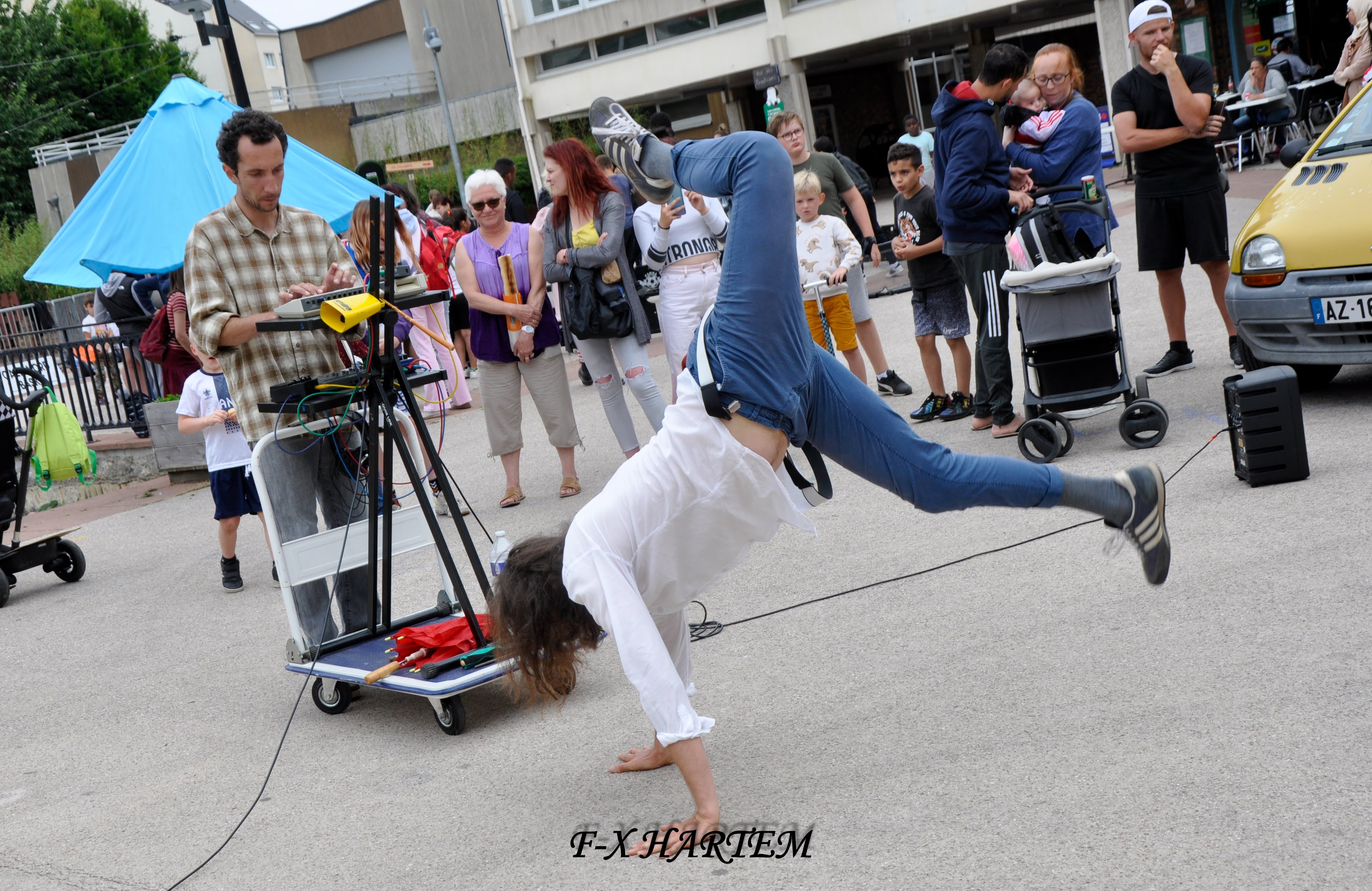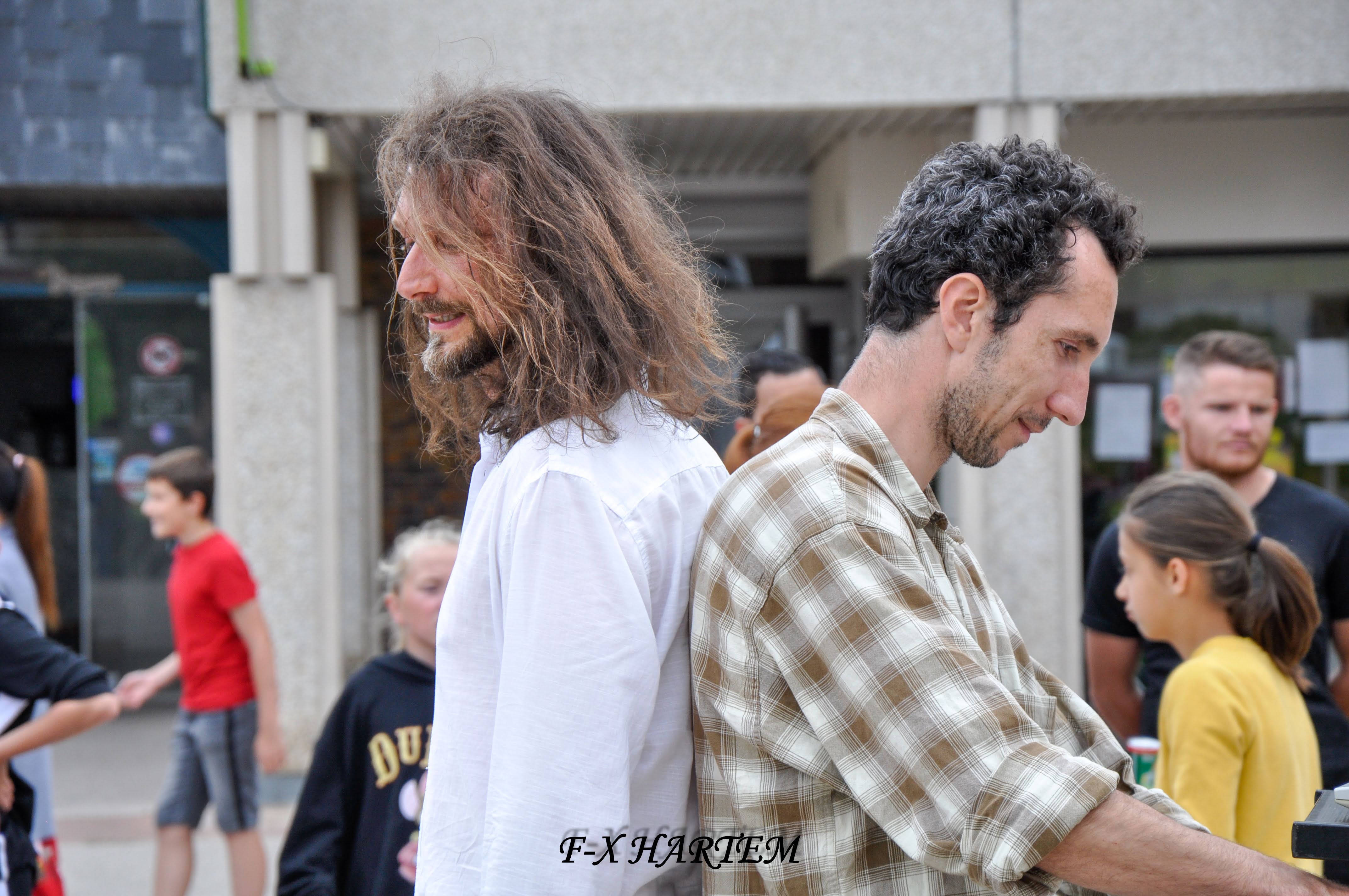 Un duo de sons et de mouvements rebondissant, par Yann à la musique et Arnaud à la danse, dans l’espace public, avec une installation sonore mobile.